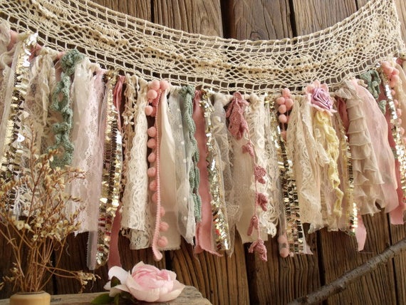 Shabby Boho Chic Blush Rosa Oro Cumpleanos Estandarte Vivero Valance Crochet Encaje Sparkle Lentejuelas Guirnalda Cuna Garland Ventana Tratamiento